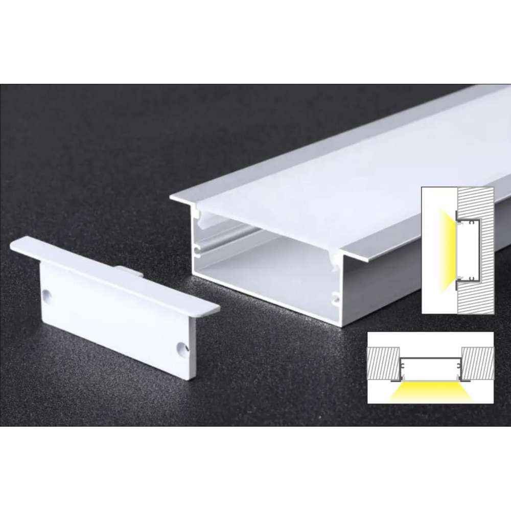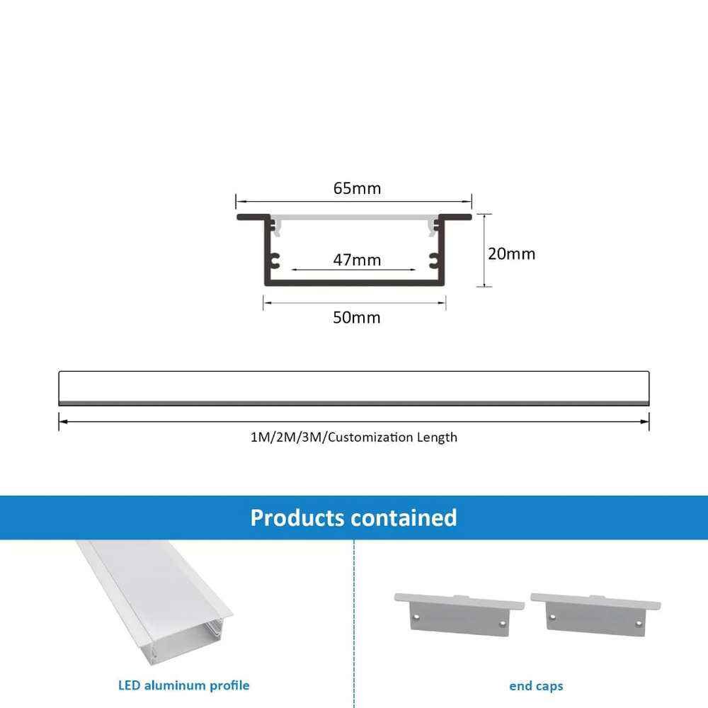“1.Elevate your lighting game with our meticulously crafted 50*20mm LED Profile, designed to infuse your space with brilliance and versatility. Engineered for seamless integration with LED Strips, this profile boasts a sleek design coupled with an opaque acrylic diffuser, ensuring a soft, uniform glow that transforms any environment.